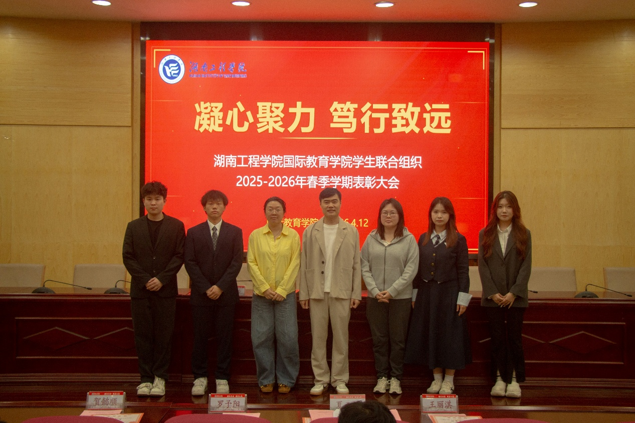 4 月 12 日晚,湖南工程学院国际教育学院 2026 年春季学期学生联合组织表彰大会在图书馆第二报告厅顺利举行。学院学工办全体教师、第二十二届团学会主席团成员、全体团学干部干事及党务中心成员参会。