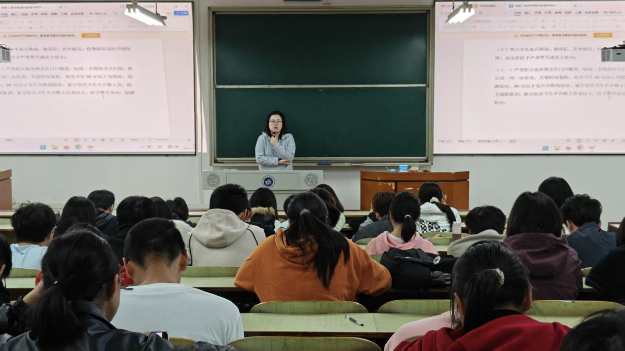 王慧和周宁莎围绕“纪律护航成长,规范助力成才”主题,结合国际教育学院的办学特点,对学院的各项规章制度进行了全面讲解。她们用“身边事”为同学们敲响警钟。“有同学因违规使用大功率电器宿舍引起火灾,这些教训要记牢。”从课堂出勤、学术诚信、宿舍安全到国际交流中的外事纪律,王慧用通俗的语言把规章制度讲清楚、说明白,还现场解答了“请假流程怎么走”“奖助学金怎么评”等问题,让新生们心里有了底。